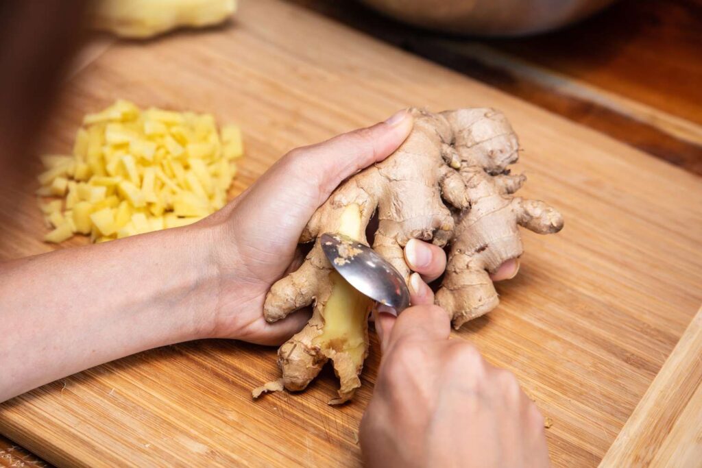 Instead of a knife, use the edge of a spoon to easily scrape off ginger skin.